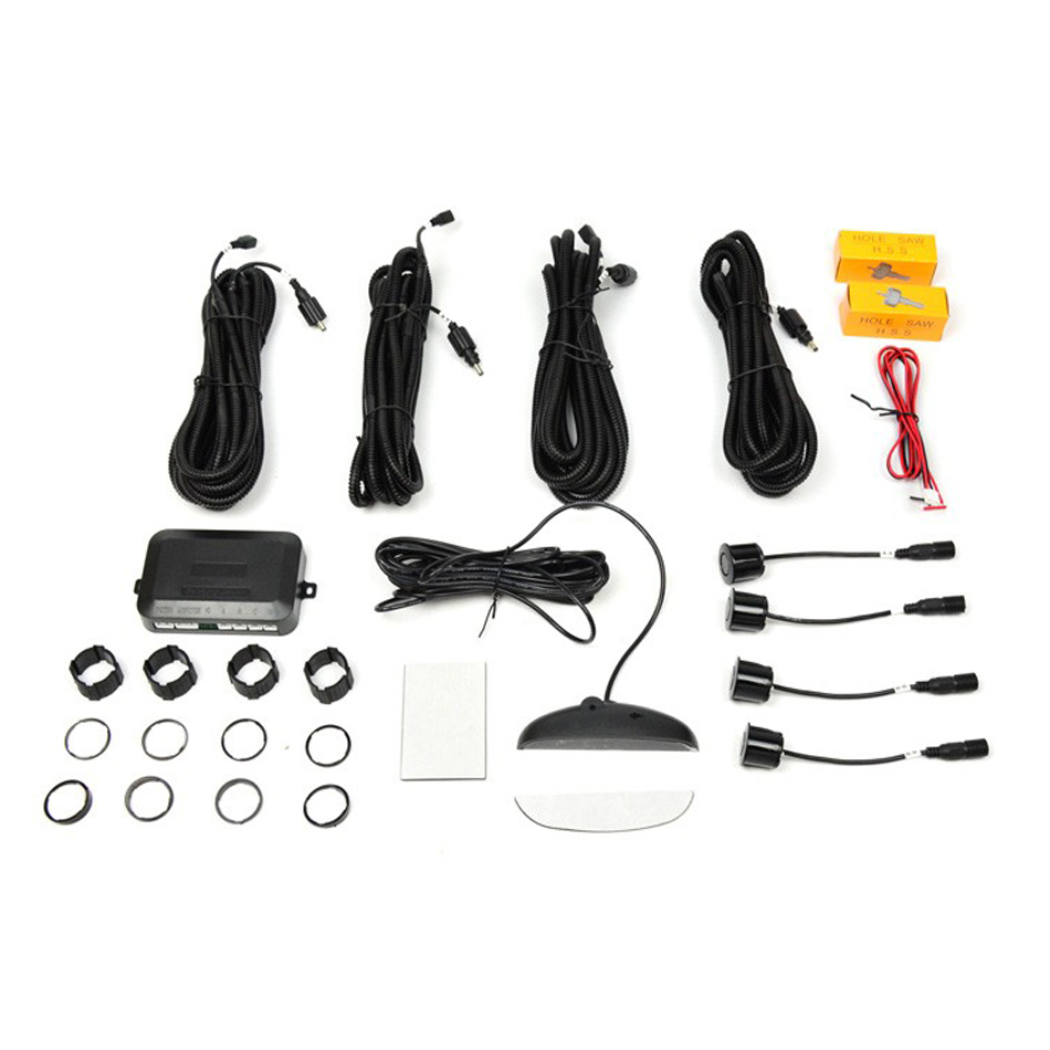 Proximity Sensor, Rear Park Assist, Bumper Mount, 4 Sensor, Round, LED Display, Brackets / Display / Hole Saws / Sensors / Sending Unit / Wiring, Plastic, Black, Universal, Kit