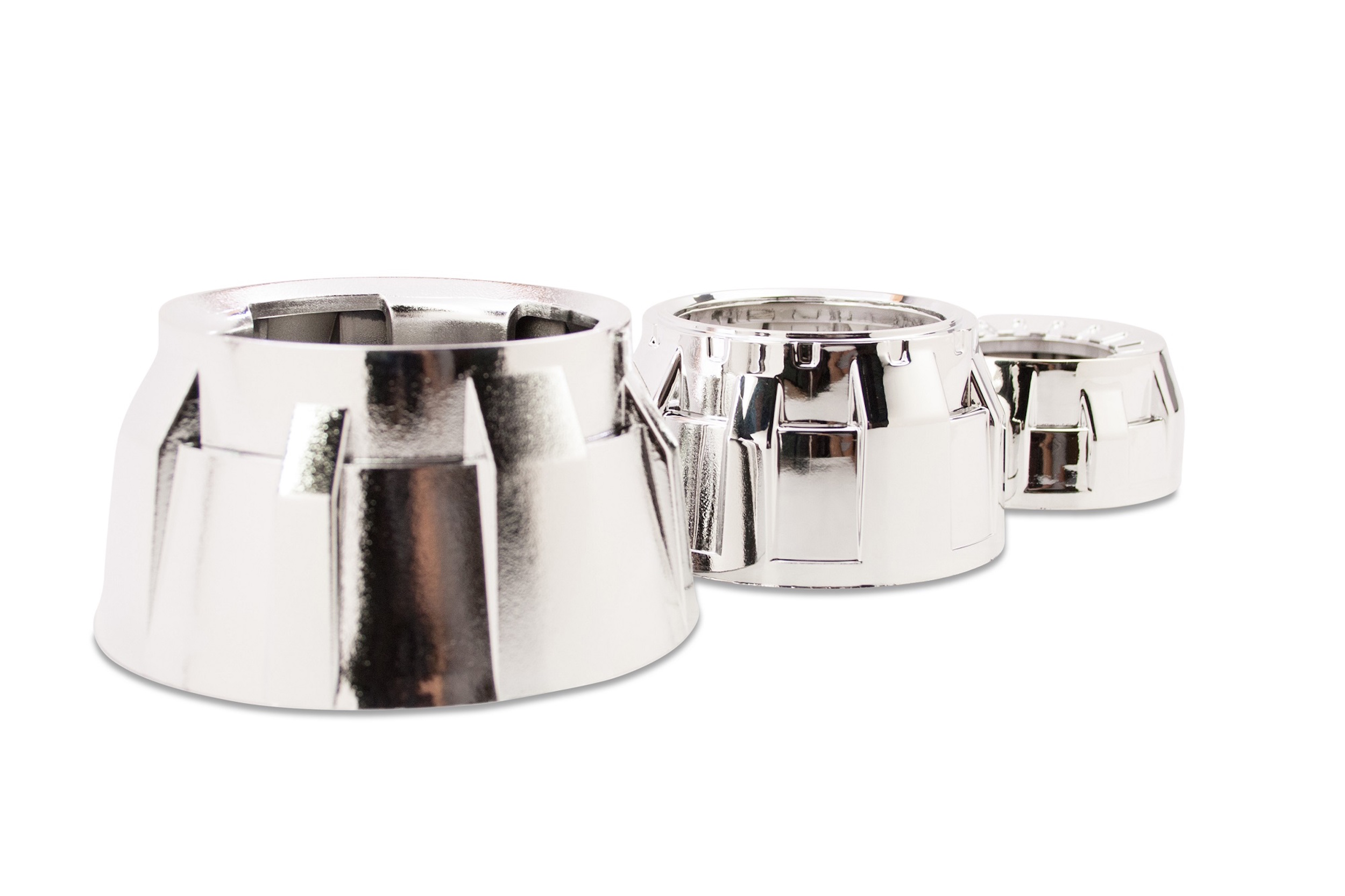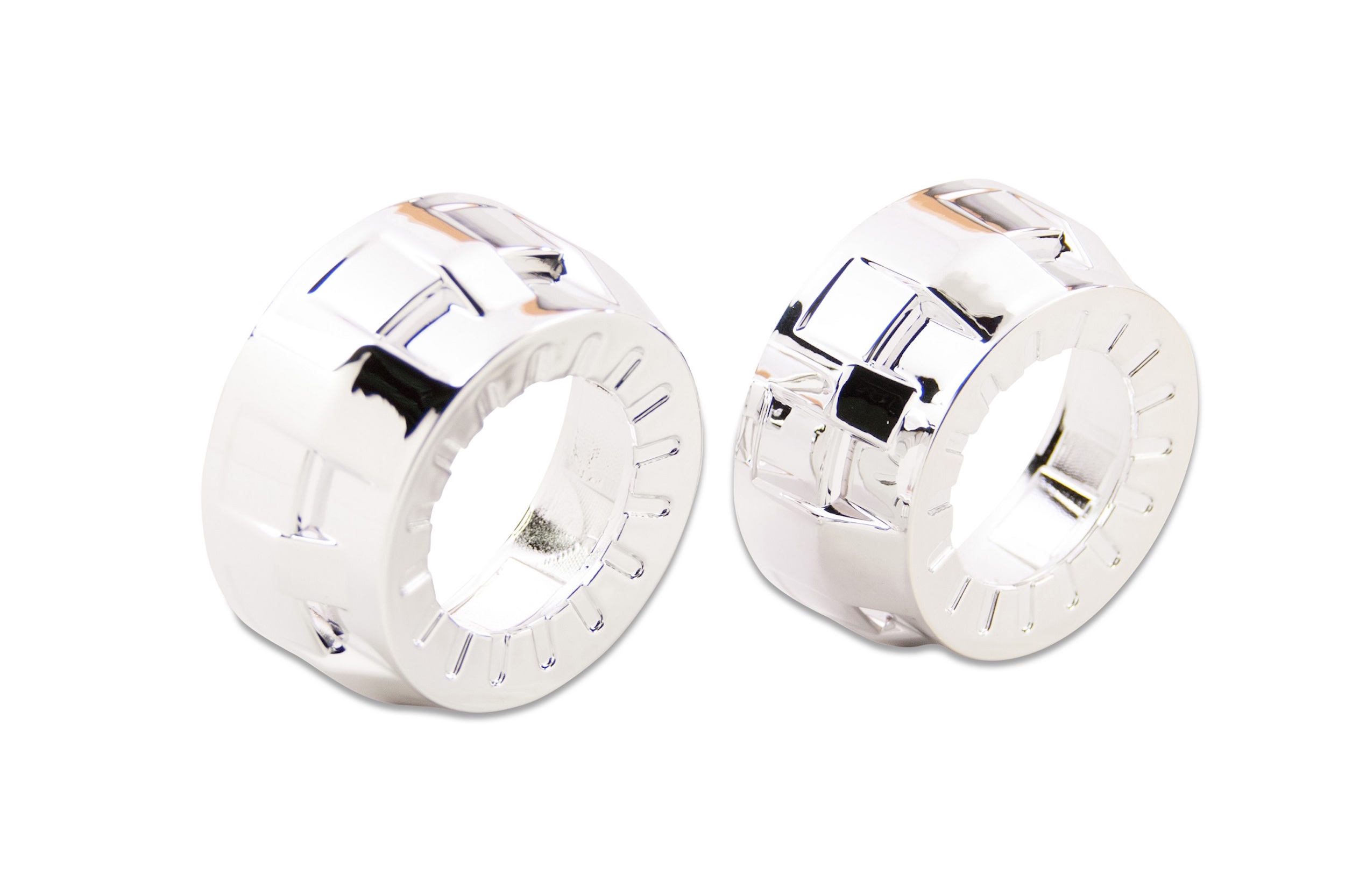 MicroGatling: The Micro Gatling Gun is the smallest version of the popular Gatling Gun design, made for use exclusively with the Morimoto Matchbox bi-xenon projectors, it should also work well on a variety of other OEM Fog Light projectors. In Comparison: Don't make the mistake of thinking all shrouds are created equal. Even though less expensive alternatives may be available elsewhere: Morimoto shrouds are made from the highest quality plastic and have by far the most durable metalized chrome finishes. The cheapo's out there are flimsy enough to deform from the heat just a 35W HID bulb, and their chrome finish easily flakes off. LED Halos: Are a unique and effective way to further customize the look of your projector retrofit. The Profile Pivot (switchback) and Profile Prism (RGB) systems are easy to mount on the front of your shrouds, are reliable, and of course awesome looking. To determine which size is best for you - check out the size-guide in the images above. These shrouds feature DRL-Vents that will glow with light if you wanted to do something a bit different and mount the halos inside. Trimming: Please note that trimming shrouds is a common task when retrofitting. Whether required to clear part of the projector, or fit within the geometry of your headlight housing; it's normal. Luckily, they're made of plastic - making that easily possible. We recommend a Dremel hand tool with EZ Lock cutting wheels to make the job easy.