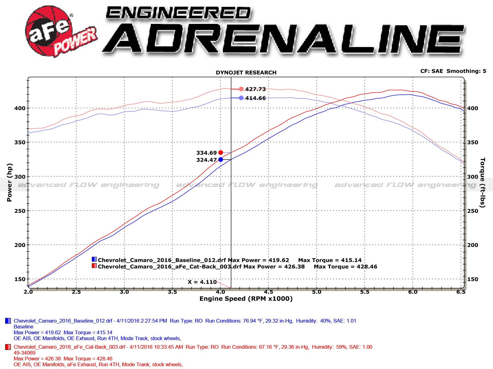 Testing: In testing, the cat-back exhaust system produced a max gain of +13 horsepower and +10 ft. lbs. of torque verified by our in house dyno