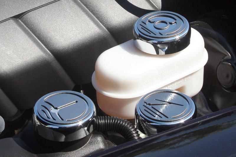 This 5pc triple chrome plated and stainless cap cover set is designed to cover your factory oil, brake fluid, water tank, windshield washer and power steering fluid caps. Installs in seconds with velcro attachment cookies for a fraction of what is costs to replace your factory caps!