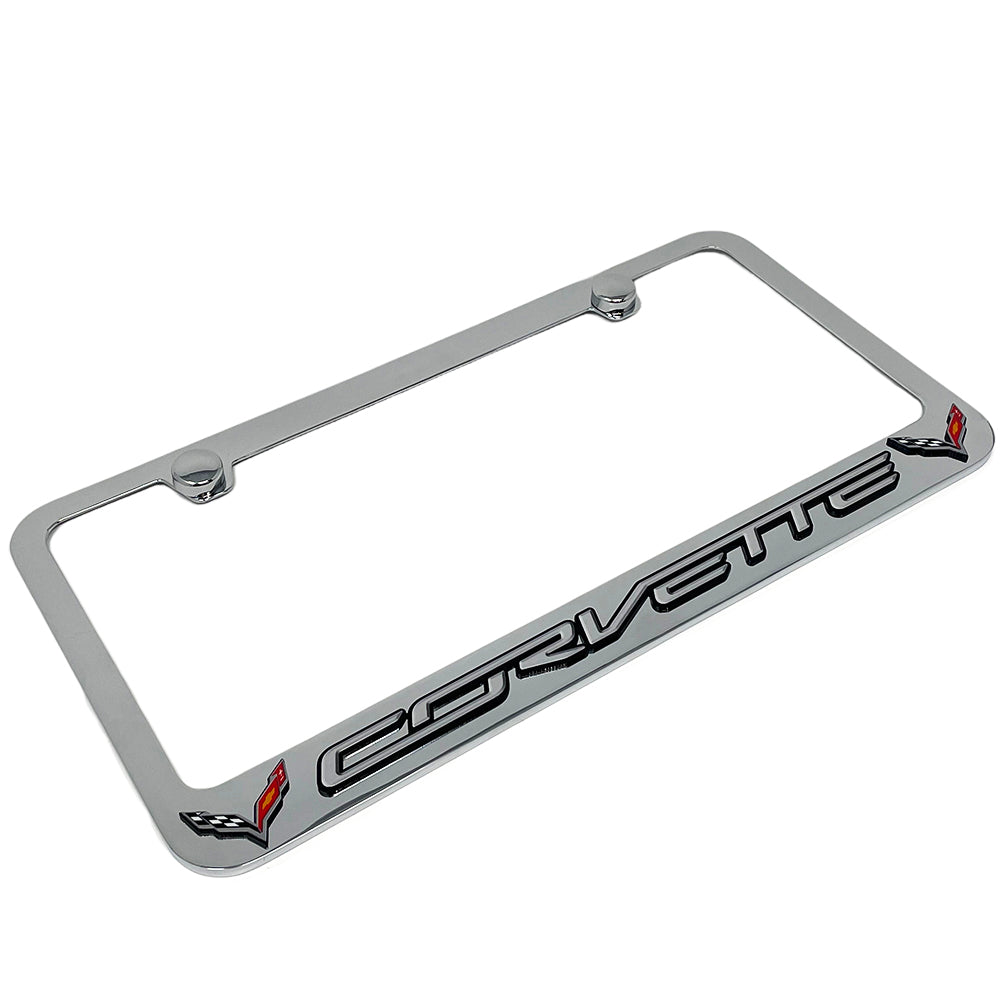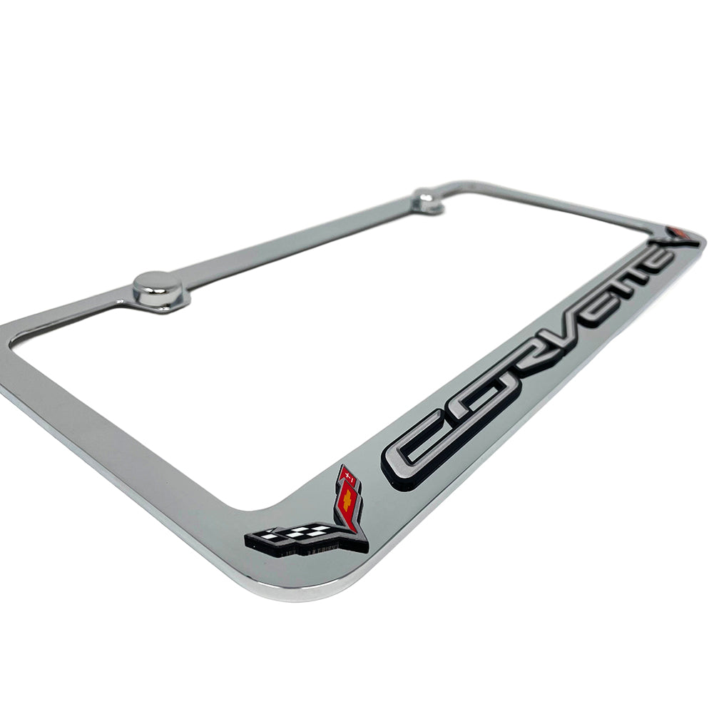 Chrome frame with Corvette Script and Crossed Flags logo on each side The frame construction is a rust proof brass/zinc alloy with two-holes and a wide bottom design. Frame lettering and logos are laser-cut and hand assembled lettering. High impact acrylic letters Made in the USA Screw and Caps included