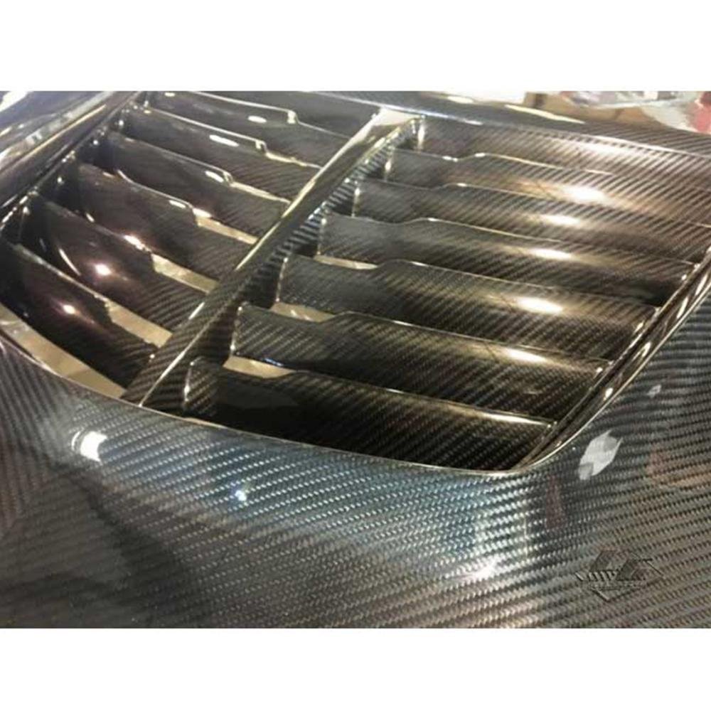 One piece design with built in louver set All carbon fiber construction Finished in a clear coat Can be primed and painted 100% bolt on design uses all factory hinge points and latches ver twice the louver opening as stock for increased cooling and downforce Race inspired design and functionality.