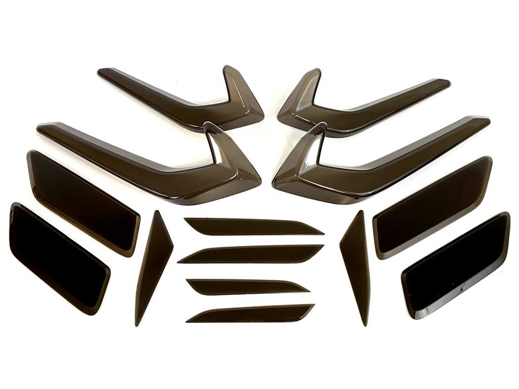 | 14 piece fully contoured, plastic injection molded acrylic. Side Large Outer Covers Side Large Inner Covers Side Outer Relfector Covers  Side Inset Light CoversSide Outer Top Covers  Side Inner Top Covers  Side Reverse Light Covers