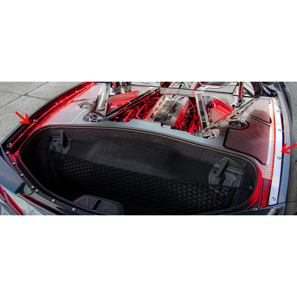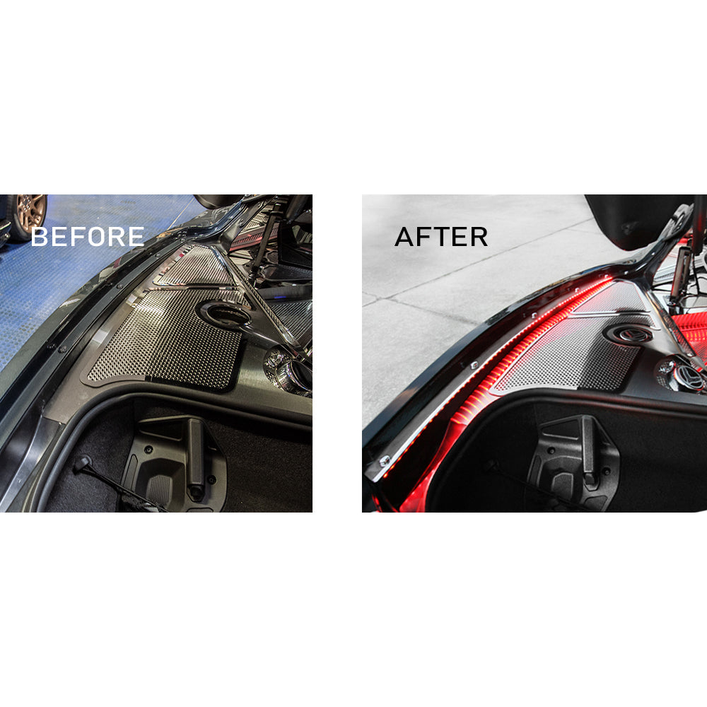 The best way to capture the attention of Judges and spectators alike is with LED illumination. Amplify the style of your mid-engine Corvette engine bay with these Polished Stainless Steel Rear Engine Compartment Fender Caps with your choice of LED color illumination or our plain No LED option. Installation of this part is very simple - remove the factory screws from the area the item is being placed, set part into place, and then replaced screws using factory holes. LED version requires professional wiring and an external battery for power source (not included). Order now and be ready for showtime.