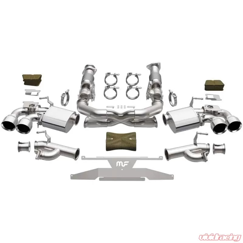 The MagnaFlow xMOD Series Catback Performance Exhaust System with polished finish #19578 for the 2020-2024 Chevrolet Corvette C8 offers the modularity of MagnaFlow's xMOD series in a compact package designed for high performance and durability. It took days of dyno and track testing to ensure that this exhaust kit does all this while enhancing the exhaust sound with our deep signature tone. MagnaFlow #19578 boosts the max power of your C8 by up to 18 hp and 17 lb. ft. of torque, with peak power gains of up to 12 hp and 13 lb. ft. of torque.