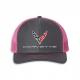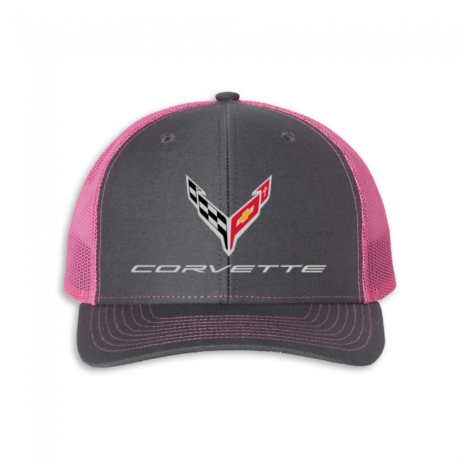 Classic Richardson® structured, mid-profile, six-panel cap with pre-curved contrast-stitched visor, matching underbill, and adjustable plastic snap-back closure. Embroidered with the C8 Corvette crossed flags and signature. 60% cotton/40% polyester front.100% polyester mesh-back.