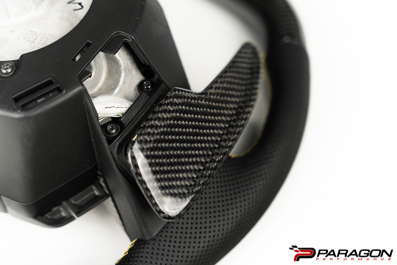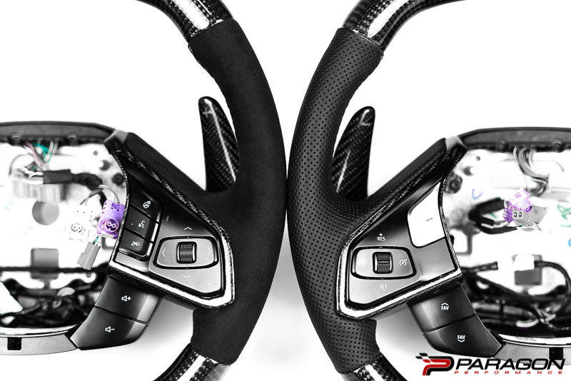 - Carbon Fiber with Leather option - 12 o'clock blue stripe - Blue Stitching - OEM Z06 style with premium look - Retains all OEM functions - Retains heats, If applicable - Carbon Fiber accents, Button Trim and Paddle Shifters