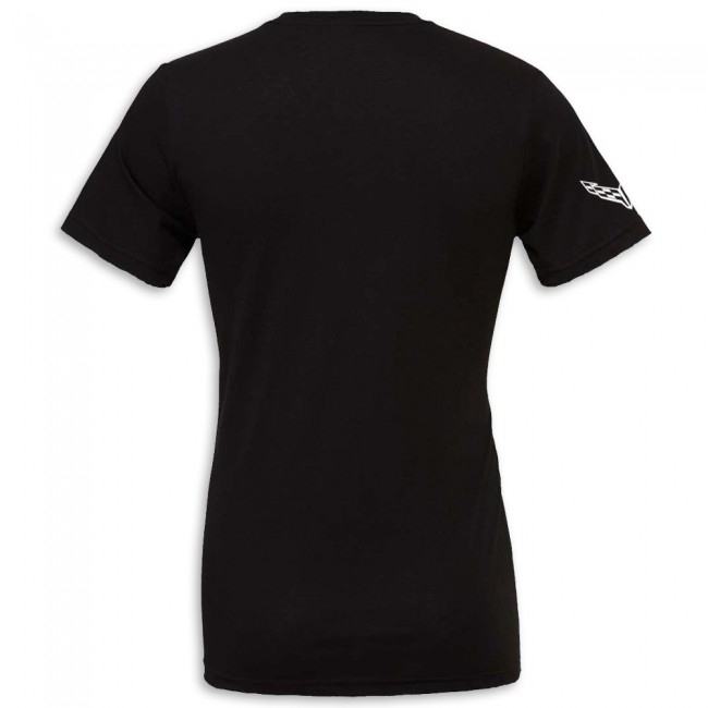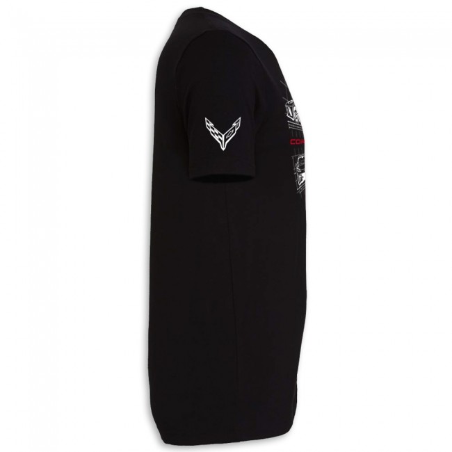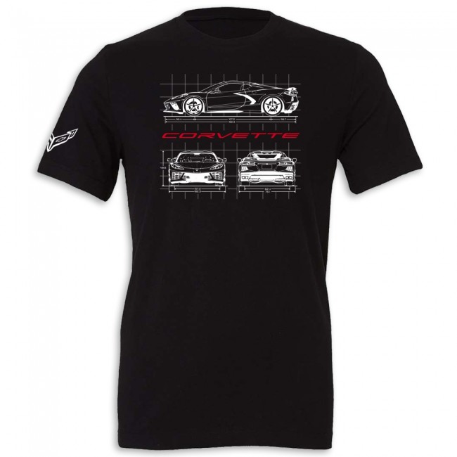 Unique graphics featuring engineering designs for the C8 Corvette Corvette. Cover-stitched collar and sleeves, shoulder-to-shoulder taping, and side seams, retail fit with unisex sizing. 100% cotton.