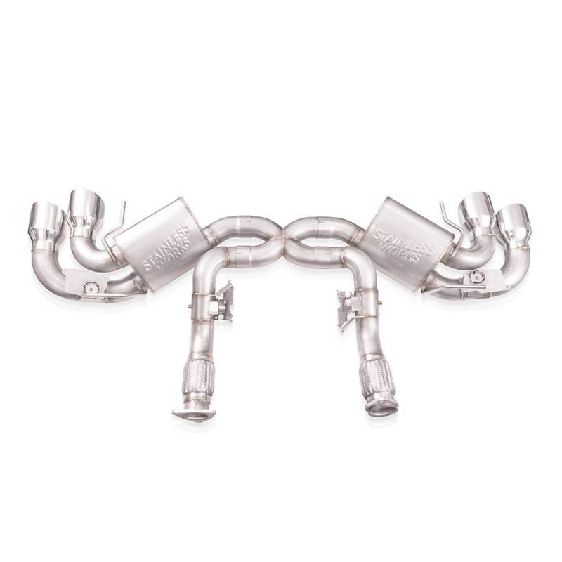 Improve the sound and performance on your 2020-21 Corvette C8 with this Legend sound catback from Stainless Works. We've engineered a drone free aggressive muffler tuned specifically for the 6.2L engine. This system features an X-pipe, tuned mufflers and quad 4-1/2" polished slash-cut double wall tips. Designed to fit to Stainless Works Midpipes or the stock manifolds and cats. This system includes high flowing 3" valve replacements for the AFM and Mode Switching electronics. Your Corvette will retain all valve functionality of the stock exhaust but with increased flow and improved sound. Our Legend series is designed to create our signature growl, increase volume over stock, yet maintain a comfortable cabin environment. We design Legend systems with the daily-driver in mind, improved tone with restrained loudness. A system that still gets the blood flowing, but allows for a comfortable ride. Stainless Works Kits are built from corrosion resistant 304 stainless steel, our headers are TIG welded for strength and durability at our state-of-the-art facility in Streetsboro, Ohio. We stand by our products with a lifetime warranty on material and craftsmanship, and as always, our products are proudly made in the USA. |