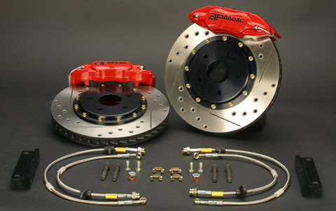 Front Kit Includes: Black or Red 6-Piston Calipers Cross-Drilled / Slotted Rotors or J-Hook 390x36mm 2-Piece Rotors