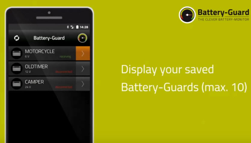 With Battery-Guard, you always know if your battery is fully charged, quickly and easily. Don't get stuck with a dead battery! • Easy to use and install • For 6V, 12V and 24V batteries • Bluetooth technology • Download the FREE App • Compatible from iPhone 4S and up, Android 4.3 and Windows 10