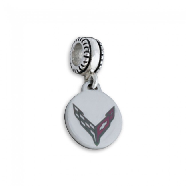 This C8 Corvette dangle charm comes with tire-looking base and full-color C8 crossed flags. The charm base is large enough to go over the screw-type bracelets and fits Pandora, Chamilia, Biagi, Pugster, Troll and other bracelets. Sterling silver base with stainless steel disc charm. Made in the USA.