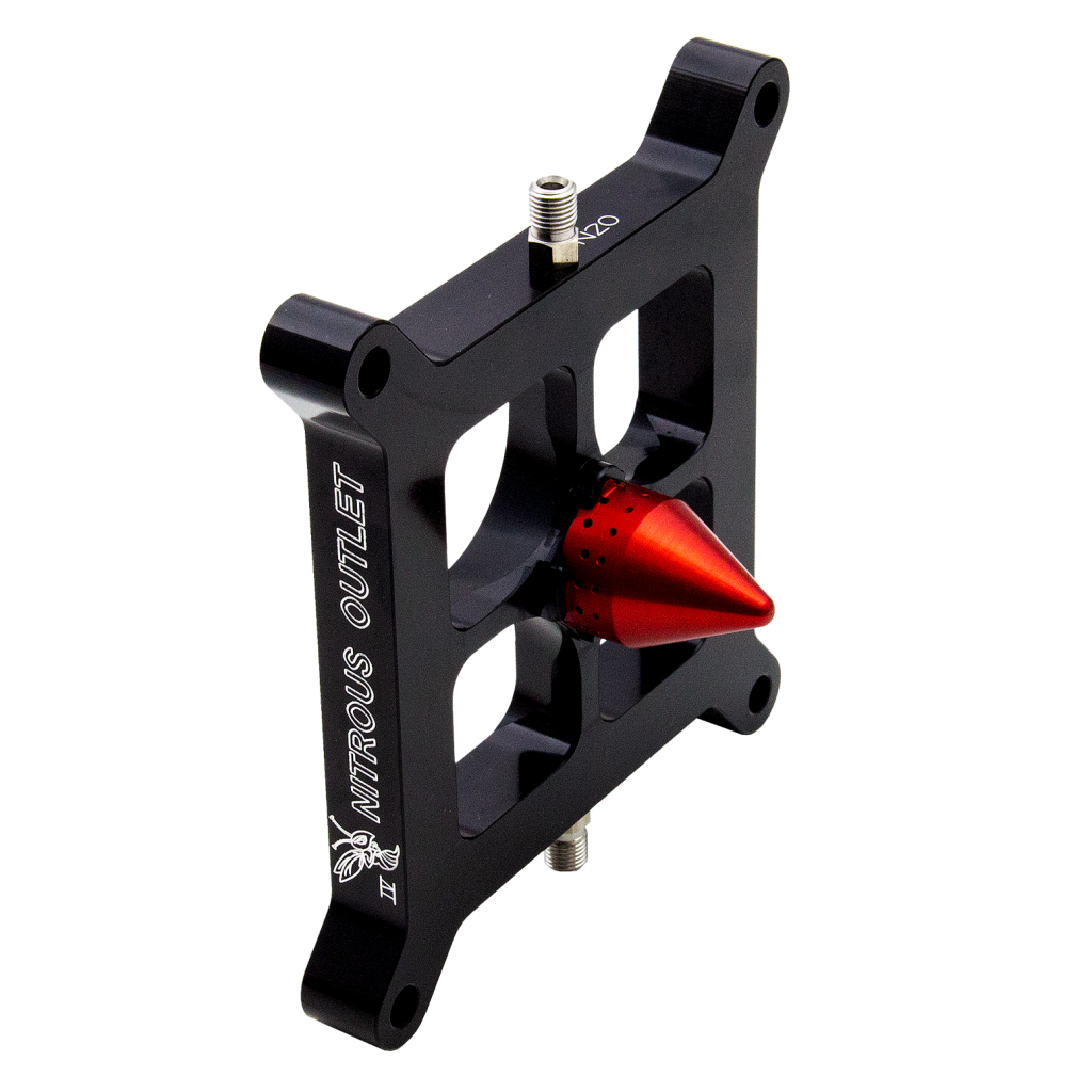 Construction: The 4150 plate and cone are manufactured from 6061 billet aluminum. The nitrous plate is .75 inch thick and black anodized with engraved Nitrous Outlet logos and Fuel/N2O entry marking. The cone is anodized red and features 16 nitrous discharge holes and 16 fuel discharge holes.