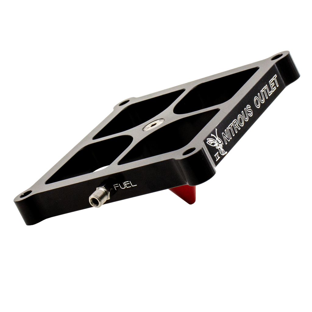 Design: The Stinger 4 is a single-entry nitrous plate that provides a max flow of 644hp. At a glance, the Stinger 4 is very similar to the Stinger 2 - however, the nitrous and fuel discharge port locations have been swapped. The nitrous discharge ports are on top and discharge at a 20 Degree angle towards the corner intake runners and a 30 Degree angle towards the center intake runners.