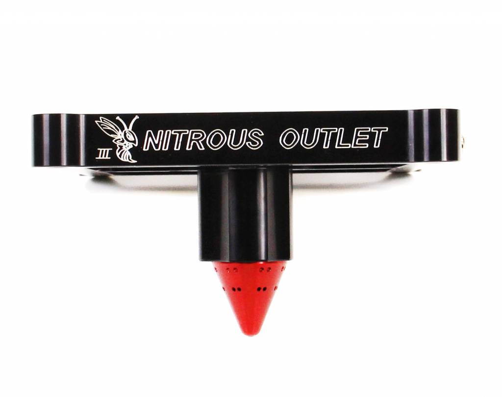 Construction: The 4500 plate and cone are manufactured from 6061 billet aluminum. The nitrous plate is .75 inch thick and black anodized with engraved Nitrous Outlet logos and Fuel/N2O entry marking. The cone is anodized red and features 16 nitrous discharge holes and 16 fuel discharge holes that discharge 1-7/8 inch below the carb flange.