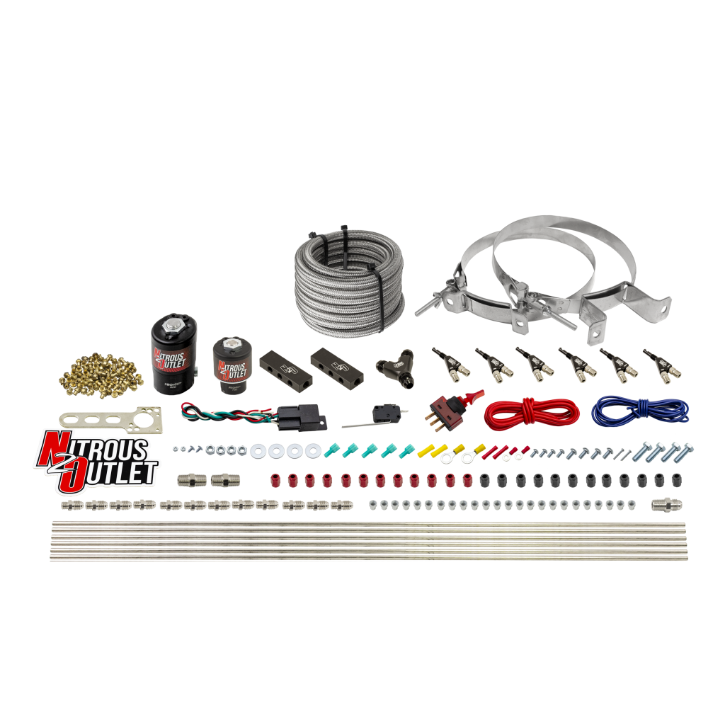Complete System: This system includes all of the necessary components; One .122 nitrous and one .177 fuel solenoid, 6 wet 90 Degree aluminum nozzles, 12ft of hardline, all jetting, hardware, and electrical to install a direct port nitrous system capable of flowing 400 and up HP per stage on your vehicle.