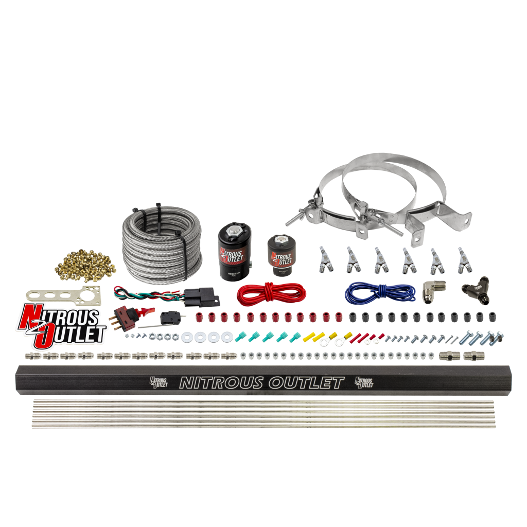 Complete System: This system includes all of the necessary components; One nitrous, and fuel solenoid, 6 wet stainless steel straight blow through nozzles, 12ft of hardline, all jetting, hardware, and electrical to install a direct port nitrous system capable of adding 400 and up HP per stage to your vehicle.