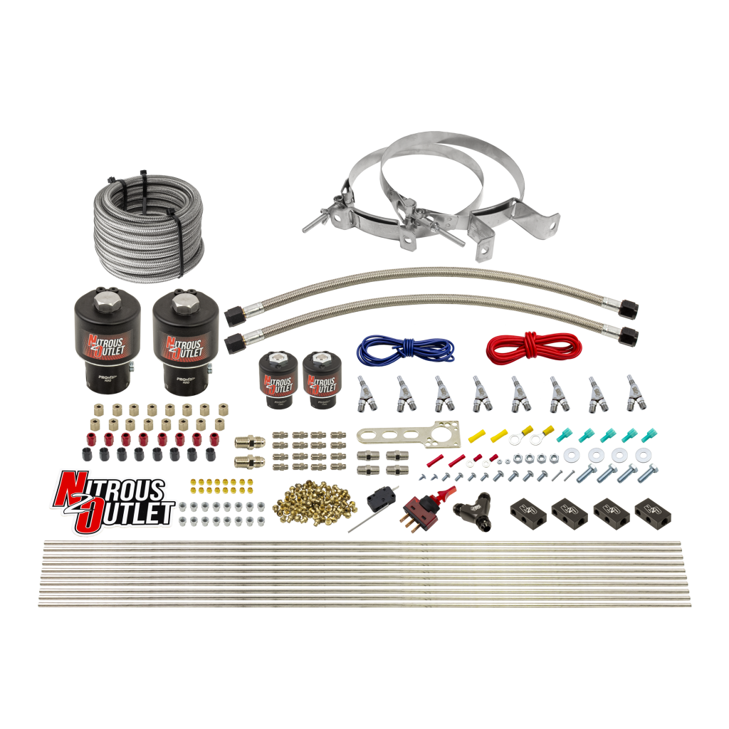 Complete System:Â This system includes all of the necessary components; two .178 nitrous solenoids and two .177 fuel solenoids, 8 Titanium Vortex Ti 1/16 inch NPT wet nitrous nozzles, 20ft of hardline, all jetting, hardware, and electrical to install a direct port nitrous system capable of adding 800 HP per stage to your vehicle.