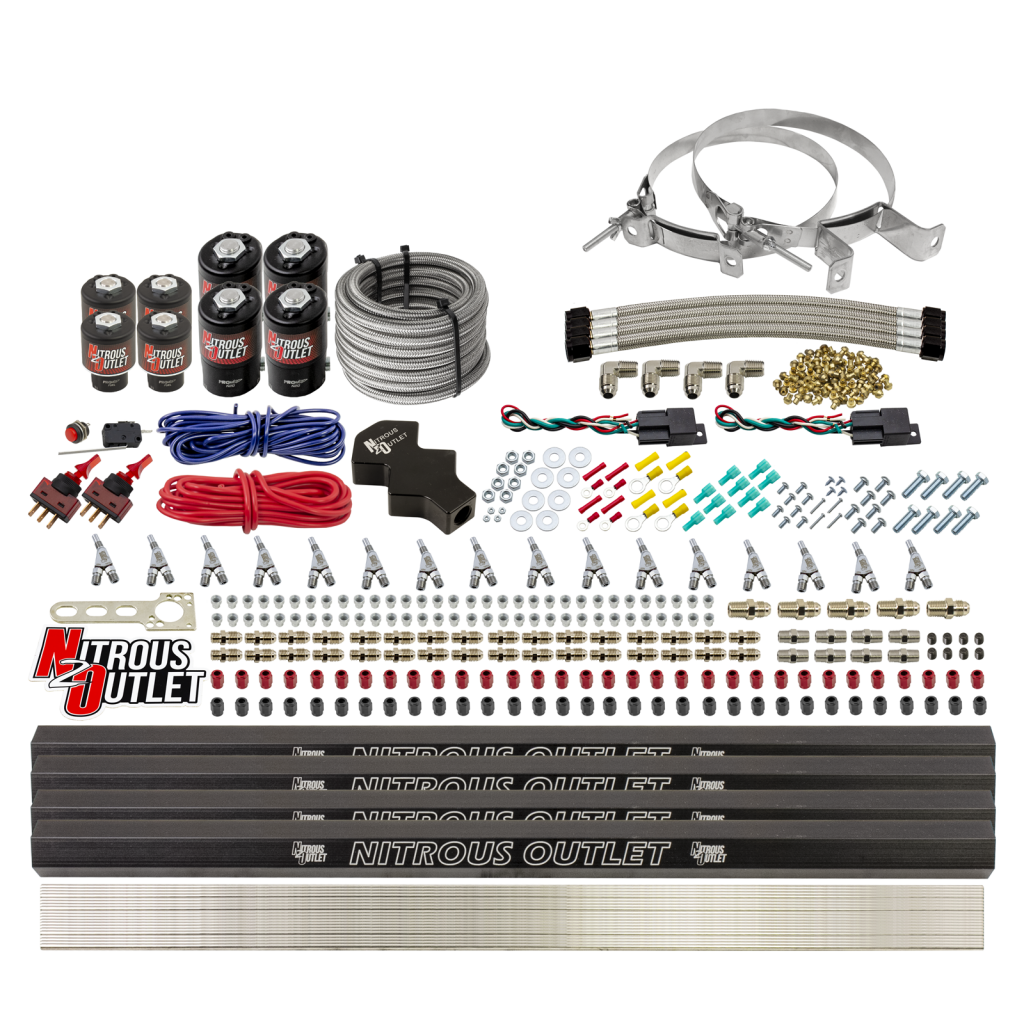 Complete System: This system includes all of the necessary components; four .112 nitrous solenoids, and four .177 fuel solenoids, 16 straight blow through aluminum nozzles, 40ft of hardline, all jetting, hardware, and electrical to install a direct port nitrous system capable of adding 400 HP per stage to your vehicle.