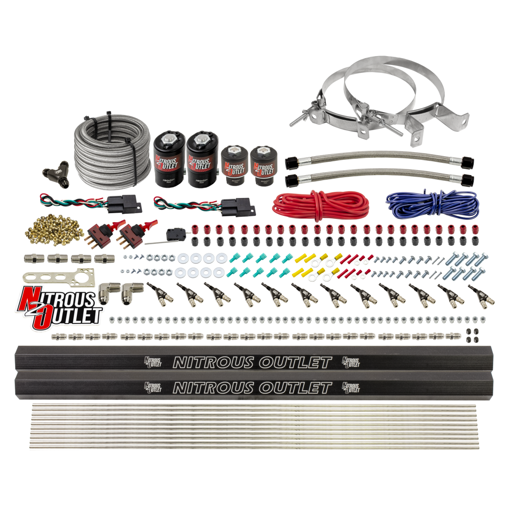 Complete System: This system includes all of the necessary components; Two nitrous, and fuel solenoids, 12 wet nozzles, 12ft of hardline, all jetting, hardware, and electrical to install a direct port nitrous system capable of adding 800 and up HP per stage to your vehicle.