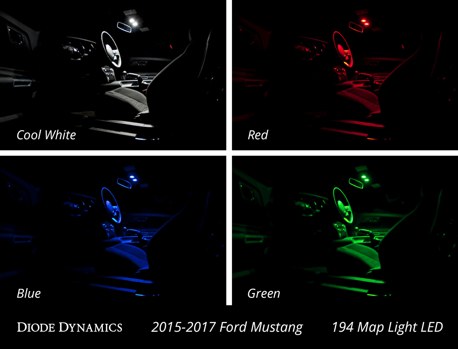 Upgrade. Add a modern appearance to your Ford Mustang with this Interior LED Conversion Kit. This kit includes all the LEDs you need to replace the factory map, vanity, glove box, and trunk incandescent bulbs. These bright LEDs are available in a number of colors including cool white, red, blue, and green to match your unique style.